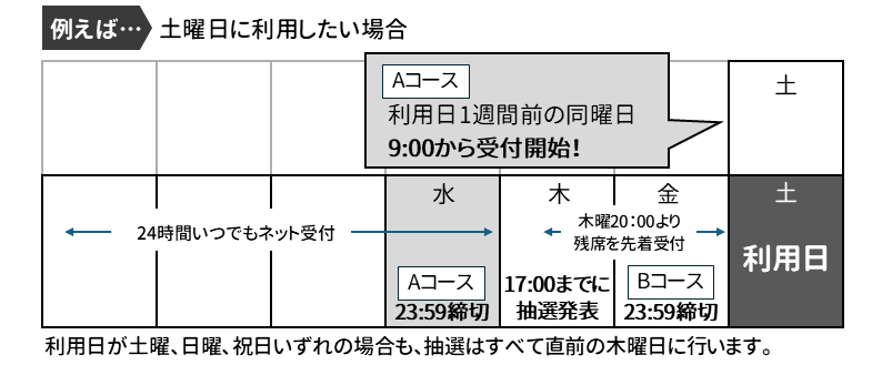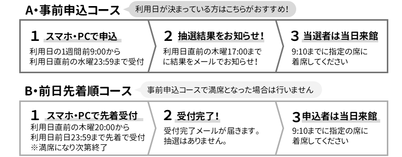 A.事前申込コースとB.前日先着順コースの2種類があります。いずれも開館時の席を確保するもので、好きな時間に座席の予約ができるシステムではありません。