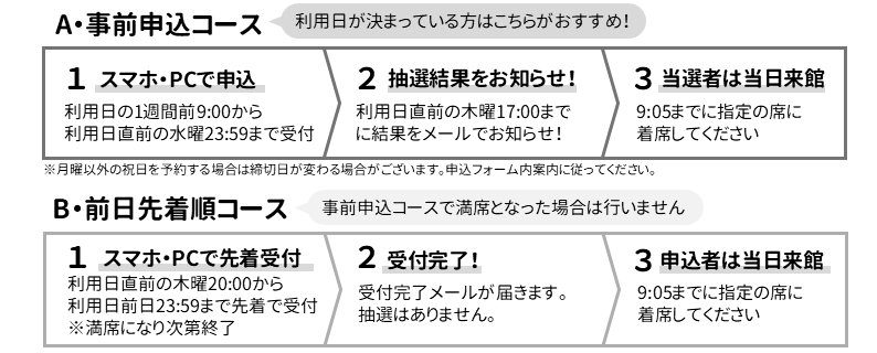 午前9時10分以降に来館される方は、抽選ではなく先着順(席が空き次第のご利用)となります。
